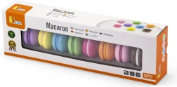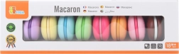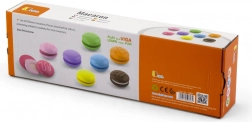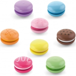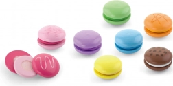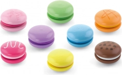 Il set include 8 macaron realizzati in modo realistico in delicate tonalità pastello. Ogni macaron è composto da due parti unite dal velcro, così i bambini possono facilmente “dividerlo” e ricomporlo, allenando la presa, la coordinazione mano-occhio e scoprendo combinazioni di colori.