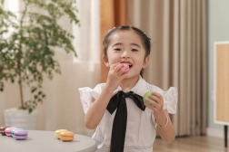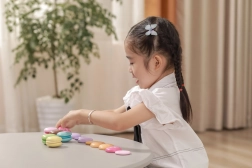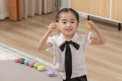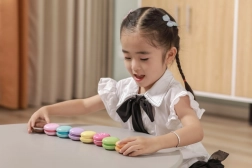 Le due metà di ogni macaron sono unite dal velcro: i bambini possono separarle e ricomporle in nuovi “gusti”, allenando le dita e la coordinazione.