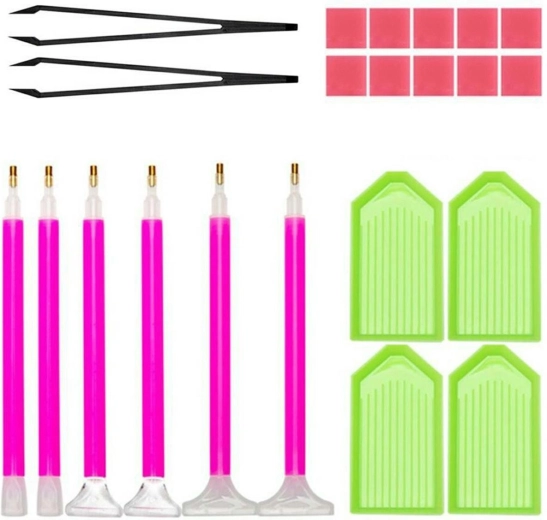 Set di 22 accessori per ricamo/pittura diamantata (diamond painting). Set completo per iniziare la tua avventura con il mosaico diamantato. Il set include 6 penne con punte manuali, 2 pinzette, 4 vaschette per diamanti e 10 quadratini di adesivo.