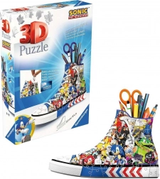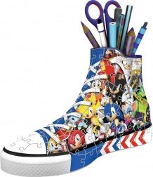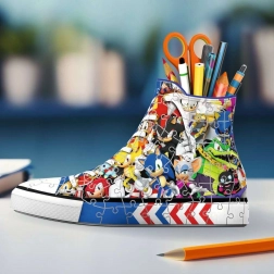 Scopri il puzzle 3D Ravensburger a forma di sneaker con il motivo di Sonic il riccio, che può servire come portapenne, porta pastelli o porta pennelli originale. Il montaggio è facilitato da pezzi curvi e flessibili che si incastrano perfettamente, creando una struttura solida e stabile senza necessità di colla.