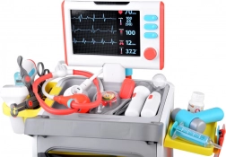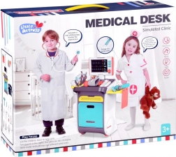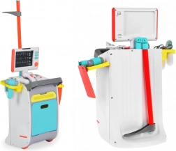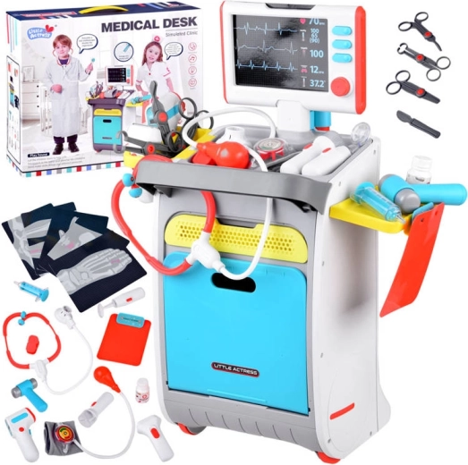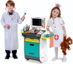 Completo set medico per bambini su carrello con ruote offre un gioco del dottore realistico già dai 3 anni. Include strumenti interattivi, monitor ECG/RX con suoni, lavandino e sterilizzatore degli strumenti, mensole e cassetti e un misuratore di altezza fino a 112 cm. La struttura robusta e i colori vivaci favoriscono un gioco creativo ed educativo.