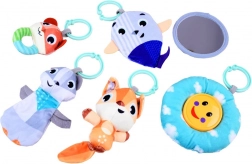 Un set di animaletti sospesi con sonagli, parti fruscianti, specchietto sicuro e sole musicale stimola vista, udito e tatto del bambino.