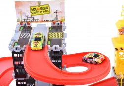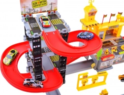 Il garage multilivello con rampe rosse a scivolo permette una discesa fluida delle auto e un gioco dinamico. Posti auto e ingressi supportano un traffico realistico.