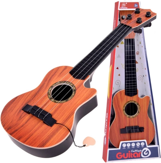Leggera chitarra per bambini con effetto legno e quattro corde metalliche, ideale per i primi passi musicali. Grazie alle dimensioni compatte si impugna bene ed è facile da suonare. Include un plettro e una semplice possibilità di accordatura di base sul manico per un suono migliore. Favorisce lo sviluppo del senso del ritmo, della motricità e della creatività. Un’ottima scelta per i piccoli musicisti e il primo incontro con il mondo della musica.