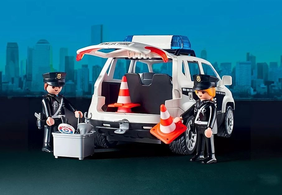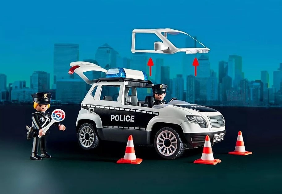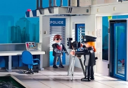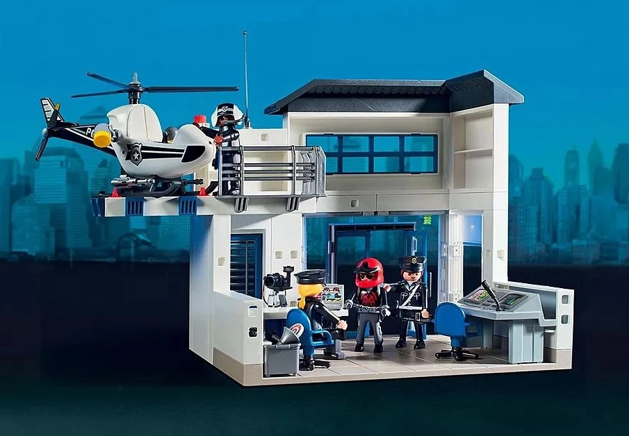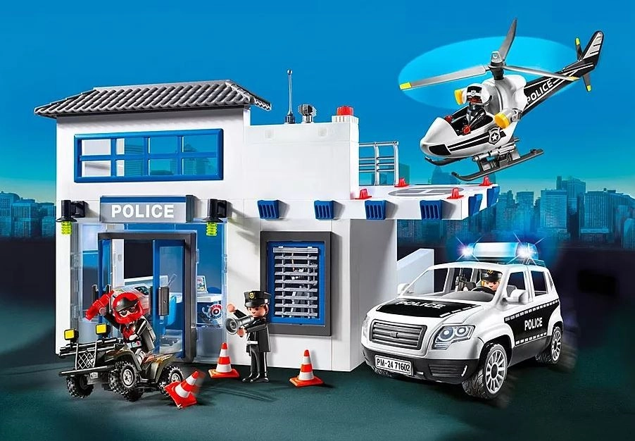 Nel centro di comando della grande stazione di polizia è stata ricevuta una chiamata d'emergenza. Il ricercato sta fuggendo su un quad! Il grande portone della stazione è già aperto e l'inseguimento a sirene spiegate ha inizio. Una volta catturato il sospetto, vengono rilevate le impronte digitali e il criminale viene identificato. Tuttavia, il prigioniero riesce a fuggire da una delle due celle attraverso un buco nel muro. La stazione di polizia dispone di spazio per un'auto della polizia (non inclusa) e sul tetto è presente una piattaforma di atterraggio per l'elicottero.