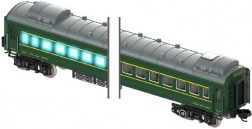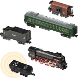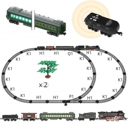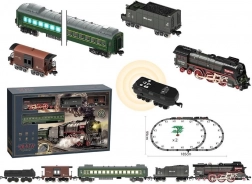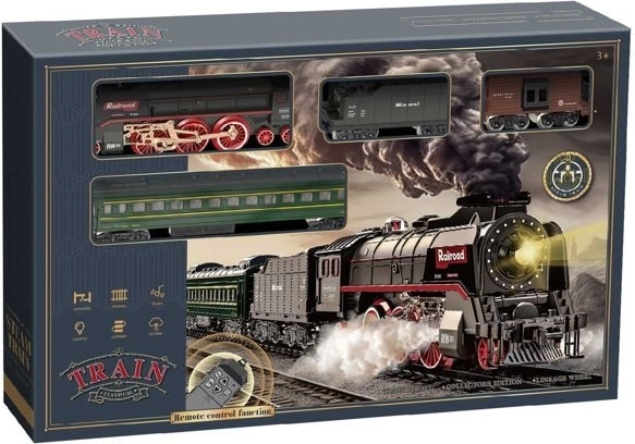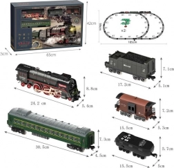 Locomotiva + 4 vagoni, luce, pista sonora. Dimensioni: dimensioni della confezione con finestra: 65x7,5x42 cm. Ricarica tramite USB. Vagone illuminato per i passeggeri. Funzione fumo nella locomotiva.