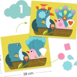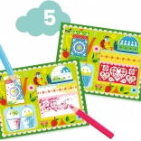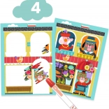 Contenuto del set: collage con carta illustrata, tavola pretagliata in cartone spesso e tubetto di colla; collage in feltro con 12 tavole e 4 fogli di pezzi in feltro autoadesivi; Color Stop con 4 fogli, stencil e 4 matite colorate; acquerelli con carta e penna magica; rivelazione dei colori con 3 carte con rivestimento magico; graffiatura con 3 carte e strumento in legno; e chiare istruzioni illustrate.
