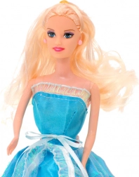 La bambola con un bellissimo vestito blu e lunghi capelli biondi è pronta per tutte le storie fiabesche dei bambini.