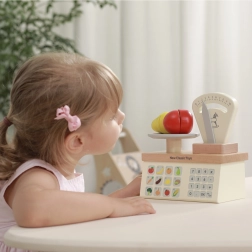 Una stilosa bilancia in legno per piccoli commercianti che trasforma l’apprendimento in un gioco. I bambini allenano il calcolo, la misurazione del peso e il gioco di ruolo con frutta e verdura. Il meccanismo a molla integrato sposta l’indicatore in base al carico e i colorati pulsanti con numeri e immagini stimolano creatività e comunicazione. Ideale come accessorio per la cucina o il negozietto dei bambini.