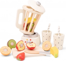 Il set include cinque tipi di frutta in legno: banana, fragola, mela, arancia e kiwi. Ogni frutto è diviso in due pezzi e unito con velcro, grazie al quale i bambini possono facilmente “tagliarlo” sul tagliere incluso usando il coltello giocattolo. Non mancano due bicchieri con cannucce per servire le deliziose creazioni.