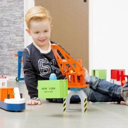 Stimola la fantasia dei bambini e permette di inventare storie ambientate nel porto. La manipolazione della gru sviluppa la coordinazione mano-occhio e la motricità fine, mentre gli elementi magnetici facilitano il sollevamento e lo spostamento dei “container”.