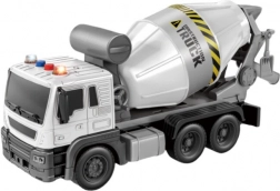 Nella parte posteriore del veicolo si trova un tamburo bianco, mobile e rotante, dotato di scivolo girevole. Si mette in movimento tramite un pulsante posizionato sulla parte laterale anteriore. Il canale è mobile, si può manovrare a destra o a sinistra e sul retro è appesa una piccola paletta grigia, così potrai iniziare facilmente a lavorare nel cantiere dei giocattoli. Il giocattolo è realizzato in stile molto realistico, con adesivi tipici di questo tipo di veicolo e molte riproduzioni di dettagli importanti. Il veicolo è in scala 1:16.