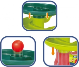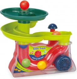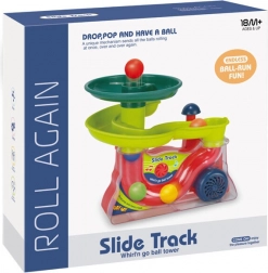 La pista a spirale riporta le palline nel meccanismo creando un ciclo di gioco continuo che coinvolge i bambini per molti minuti.
