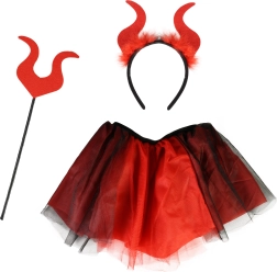 Adorabile costume da Diavoletta ideale per bambine di età compresa tra 3 e 7 anni. Il costume include una gonna tutu rosso-nera, un cerchietto con corna e una bacchetta, che donano alla tua piccola diavoletta un aspetto giocoso e divertente.