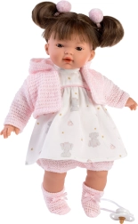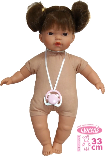 Funzionalità: Rimuovendo il ciuccio dalla bocca, la bambola dice "mama", "papa" e emette un suono realistico di un bambino che piange. Questi suoni possono essere abbattuti con il ciuccio magnetico. Il modello non include vestiti; si consiglia di acquistare abbigliamento originale Llorens per la taglia 33 cm.