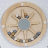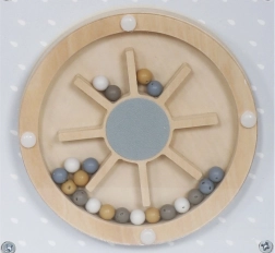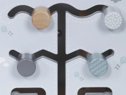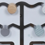 - Parte superiore: Comprende percorsi con perline su fili metallici, che aiutano il bambino a esercitarsi nei movimenti precisi delle mani e nella concentrazione.