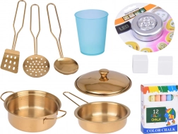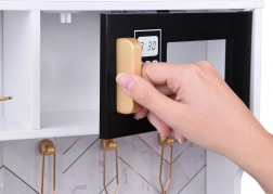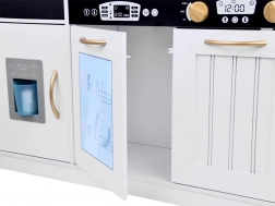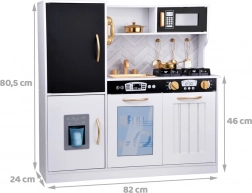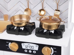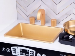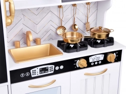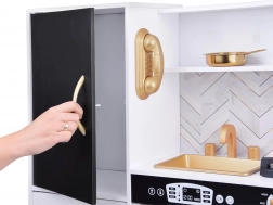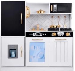 Cattura l'interesse dei bambini per la cucina con questa cucina in legno, progettata con cura per i dettagli. La cucina ha un design prevalentemente bianco con dettagli neri e dorati che aggiungono un tocco di eleganza. I bambini possono scrivere con il gesso sulla lavagna situata sul frigorifero, imitare la cottura nel forno e preparare i cibi con effetti sonori e luminosi realistici.
