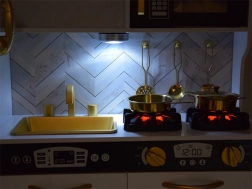 La cucina richiede assemblaggio ed è compatibile con 9 batterie AG13 per effetti luminosi e sonori, e 3 batterie AAA, non incluse, per ulteriori illuminazioni.