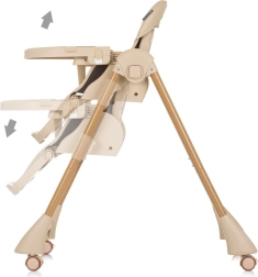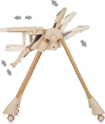 Per un pasto pulito e comodo è disponibile il doppio vassoio: la parte superiore si può rimuovere e lavare in qualsiasi momento, mentre il vassoio inferiore con barra di protezione a T mantiene il bambino al sicuro. Il vassoio può essere fatto scorrere avanti e indietro in 3 posizioni. Quattro ruote permettono di spostarlo facilmente in casa e, dopo i pasti, il seggiolone si richiude in modo compatto per risparmiare spazio.