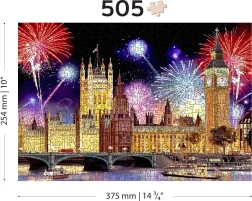 Il lato frontale offre un motivo colorato della Londra notturna con fuochi d’artificio, mentre il retro presenta un motivo ripetuto per il montaggio basato sulle forme. Ideale per allenare concentrazione e percezione spaziale.
