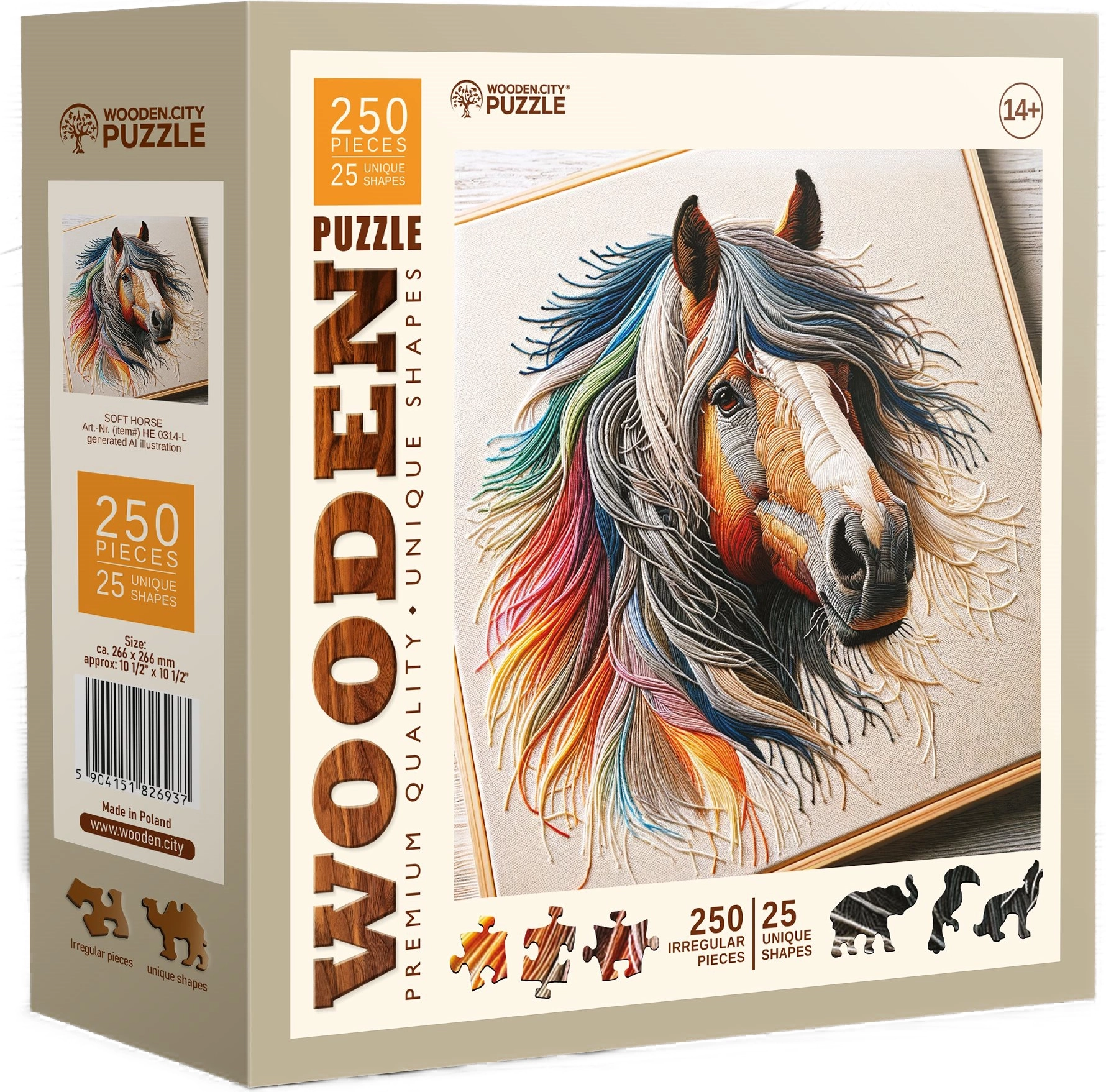 Il puzzle completato misura circa 26,6 × 26,6 cm e diventa una splendida decorazione oltre a una piacevole sfida per chi cerca un puzzle in legno di qualità con tema cavallo.
