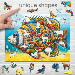 Il puzzle in legno Pesce Modaiolo di WOODEN CITY è una grande sfida grazie ai suoi pezzi sagomati speciali, alcuni dei quali hanno la forma di animali. Queste figurine possono stare in piedi da sole, arricchendo l'esperienza del montaggio. Il puzzle è realizzato in pannello HDF di fibra di legno robusto con uno spessore di 3-4 mm, garantendone la resistenza e la qualità. I bordi lisci senza schegge sono garantiti dalla lavorazione laser precisa.