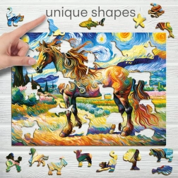 Elegante puzzle in legno con tema cavallo moderno che unisce design e divertimento. Grazie ai pezzi tagliati al laser con bordi lisci, si monta alla perfezione e parte delle tessere a forma di animali può essere usata anche come piccole figurine. Ideale come regalo originale per bambini e adulti.