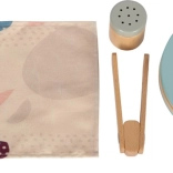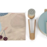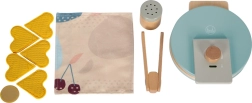 Il set include anche un tovagliolo di stoffa, pinze per servire in sicurezza e una zuccheriera che, mentre si versa, emette un piacevole suono tintinnante. La solida struttura in legno, i colori moderni e i materiali piacevoli sono ideali per la cucina dei bambini.