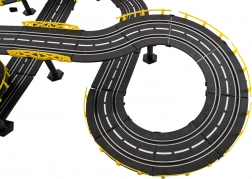 - 2 auto da corsa, .- 2 radiocomandi, .- pista in sezioni, .- barriere, .- alimentatore, . |