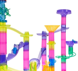 La pista per biglie, colorata e stabile, realizzata con elementi trasparenti, offre ai bambini la gioia di scoprire il movimento, la gravità e il rapporto causa-effetto. I bambini progettano e costruiscono autonomamente le strutture e poi osservano le biglie sfrecciare attraverso tunnel, spirali e imbuti. Le biglie lampeggianti alimentate a batteria aggiungono a ogni corsa spettacolari effetti di luce.