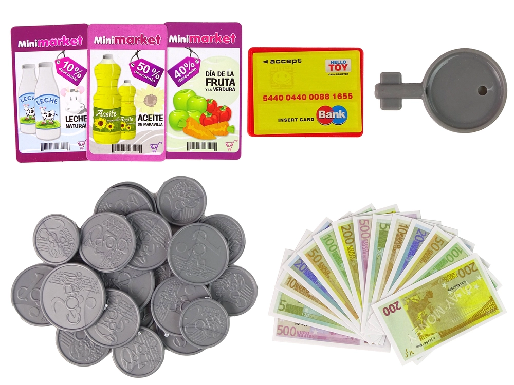 • Il registratore di cassa contiene: lettore di codici a barre, chiave di avvio, calcolatrice, cassetto per denaro, set di cartoncini e mezzi di pagamento, bottiglie di plastica con prodotti alimentari, carta di credito e lettore di carte.