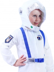 La tuta bianca con elementi argentati e patch crea un look “space” realistico che entusiasmerà ogni piccolo esploratore.