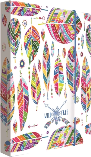 Scatola per quaderni nel formato A4 Jumbo con motivo Piume, elegante e pratica. Ideale per scolari e studenti per riporre quaderni, fogli e accessori. Grazie alla superficie laminata è resistente ai danni, mantiene l’ordine e protegge il contenuto. Comoda chiusura con elastico e dorso da 4 cm per avere spazio a sufficienza.