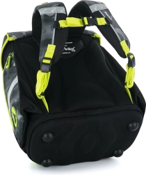 Lo zaino offre una mimetica nera e grigia con dettagli gialli, che lo rendono non solo funzionale, ma anche visivamente attraente.