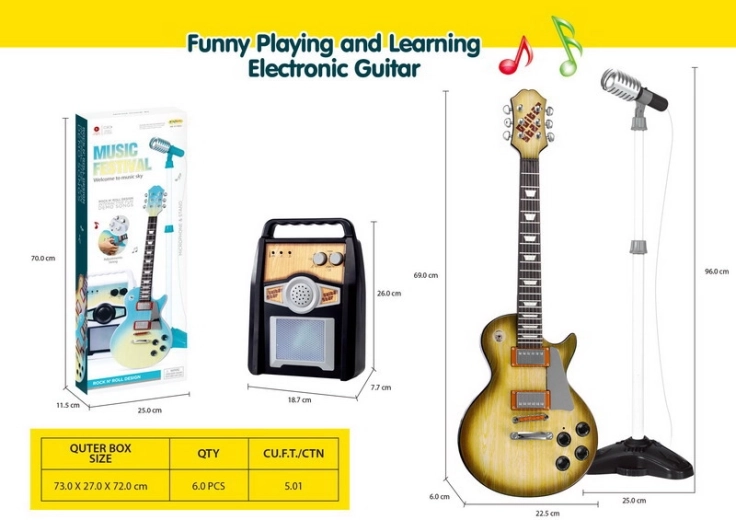 Questo set musicale creativo è la scelta ideale per bambini dai 3 anni in su. La chitarra elettrica in finitura marrone ha l’aspetto di un vero strumento; si collega all’amplificatore con il cavo in dotazione e il bambino può iniziare subito a suonare e cantare nel microfono sul supporto stabile. L’amplificatore permette di regolare separatamente il volume di chitarra e microfono, offre ingressi per chitarra, microfono e anche per un MP3 esterno. L’atmosfera è garantita dalle luci colorate che lampeggiano a ritmo.