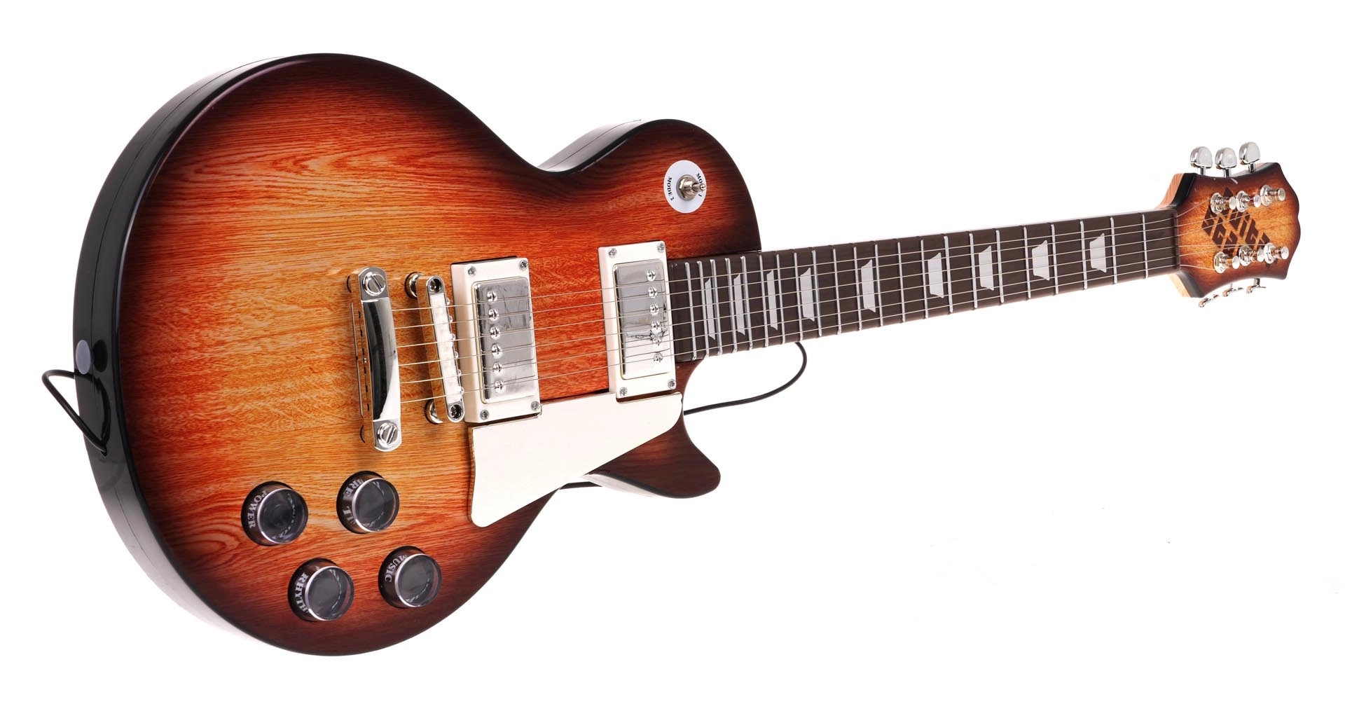 Chitarra in stile marrone “sunburst” con controlli e tracolla che invoglia i bambini alla musica. Ritmi e melodie preimpostati aiutano nei primi passi.