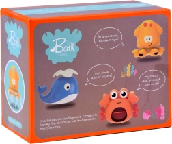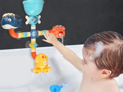 Questo set interattivo trasforma ogni bagnetto in un gioco. Versa l’acqua nell’imbuto superiore e osserva il flusso che percorre i tubicini, mette in rotazione gli elementi e crea fontanelle e cascatelle. I pezzi a tema piovra, balena e granchio si possono riorganizzare facilmente per creare nuovi percorsi.