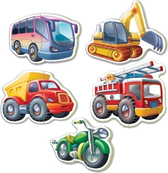 Questo set include cinque puzzle progressivi con soggetti di veicoli amati – dall’autobus al camion dei pompieri. Grazie alla difficoltà crescente (3, 4 e 5 pezzi) i bambini allenano naturalmente il ragionamento logico e la pazienza. I colori vivaci e le illustrazioni amichevoli catturano la loro attenzione e alimentano la gioia della scoperta.