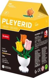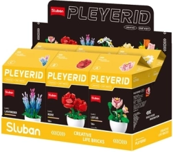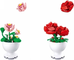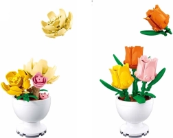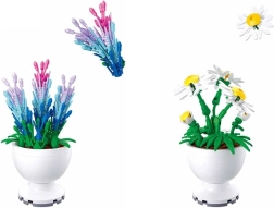 Scopri il set innovativo Sluban, che offre sei diversi tipi di fiori, tra cui rosa, lavanda, margherita, loto, peonia e tulipano. Ogni fiore è posto in un vaso bianco, creando una decorazione affascinante.