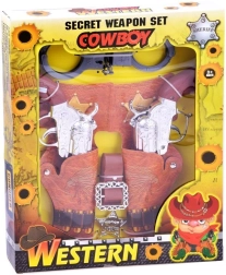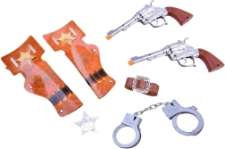 Il set include tutto il necessario per un gioco realistico da cowboy: 2 revolver, manette, cintura e stella da sceriffo.