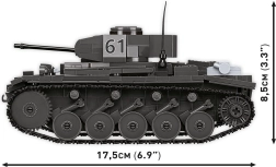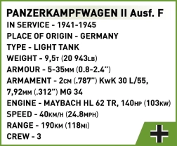 Il carro armato Panzerkampfwagen II era uno dei principali carri armati tedeschi nella fase iniziale della seconda guerra mondiale. Questo set di costruzione contiene 813 pezzi ed è realizzato in scala 1:28. I pezzi sono dotati di stampe di alta qualità che non si graffiano durante il gioco. Il modello ha un portello apribile in cui posizionare una figura del carrista. La torretta del carro armato ruota di 360 gradi, mentre il cannone con mitragliatrice è mobile su e giù. Sotto il portello c'è un motore a mattoncini che può essere esposto accanto al modello. Il set include una figura di carrista con berretto e pistola P08 Parabellum.