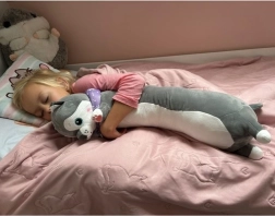 Cerchi un giocattolo universale che diverta e al tempo stesso favorisca un sonno tranquillo? Questo lungo husky di peluche offre a bambini e genitori esattamente ciò di cui hanno bisogno: morbidezza straordinaria, abbraccio caldo e avvolgente e materiali sicuri adatti anche ai neonati. È perfetto come compagno da culla, comodo cuscino lombare o elegante decorazione per la cameretta.