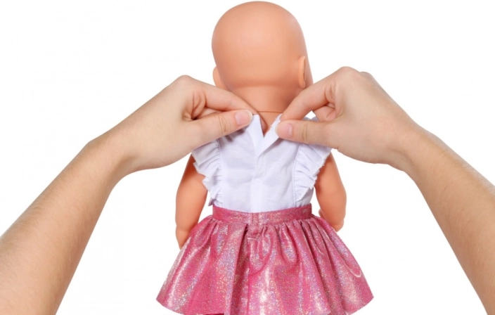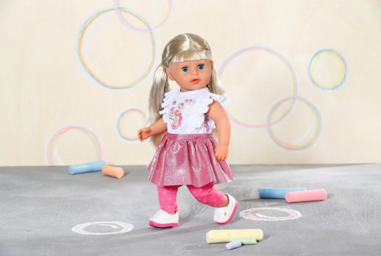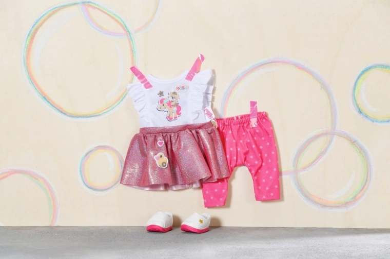 Regala alla tua BABY born Little (36 cm) un outfit incantevole che unisce comfort e stile. Il top bianco con maniche a volant e simpatica stampa può essere indossato da solo come abitino, oppure abbinato ai leggings rosa con motivo a stelline e alla gonna scintillante. Il set è completato da scarpette bianche con stelline dettagliate per un look perfettamente coordinato.