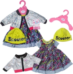 Parti per la città con grande stile. Questo set per la bambola BABY BORN 43 cm combina un elegante abito a strati con un vivace motivo di lettere, una giacca lucida con motivo argento e polsini a contrasto e un pratico berretto giallo che protegge l’acconciatura sotto il casco durante la guida dello scooter.