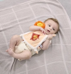 Gli angoli annodati e le morbide etichette stimolano l’esplorazione tattile e la motricità fine. Il bebè si diverte e allena naturalmente la presa.