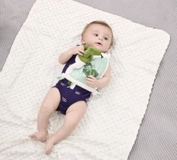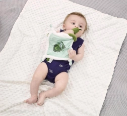 Angoli annodati, morbide etichette e dettagli ricamati favoriscono l’esplorazione naturale e lo sviluppo della motricità fine.