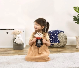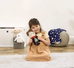 Questo peluche ufficialmente ispirato indossa l’iconico mantello nero e la sciarpa rosso-gialla (Grifondoro) che, insieme agli occhiali rotondi e alla cicatrice a fulmine, ricordano fedelmente il mago più amato. Perfetto per il sviluppo dei sensi e per rituali serali rilassanti prima della nanna.