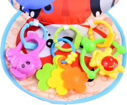 Il bebè ha davanti a sé giochini allegri che lo invogliano ad alzare la testolina e a rinforzare i muscoli della schiena.
