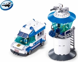 Il set include 245 pezzi precisi che possono essere assemblati per creare un ambiente realistico della polizia, comprendente un'auto e una torre.