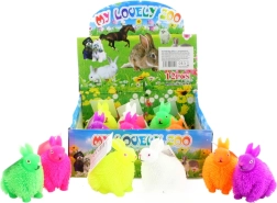 Coniglietto di gomma spettinato. All’interno c’è una pallina luminosa che lampeggia. Dimensioni ca. 8 x 7 x 5 cm. Età 3+